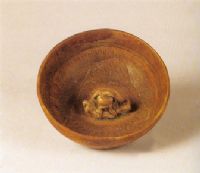 該碗施褐釉,深灰色胎,環(huán)底。碗內(nèi)下腹部施有弦紋兩道,弦紋下至碗底用深褐色彩,點(diǎn)畫成水波紋加以裝飾。碗內(nèi)底堆塑一雙魚鷹,用腳爪站在一尾鯉魚身上,鯉魚張嘴翹尾,魚鷹側(cè)首凝視,造型生動(dòng),自然質(zhì)樸。