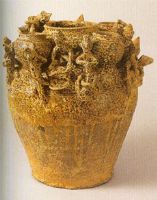 罐平底深腹,罐形口,肩部豐滿,肩上有四小罐,其間堆貼四組人物群塑。