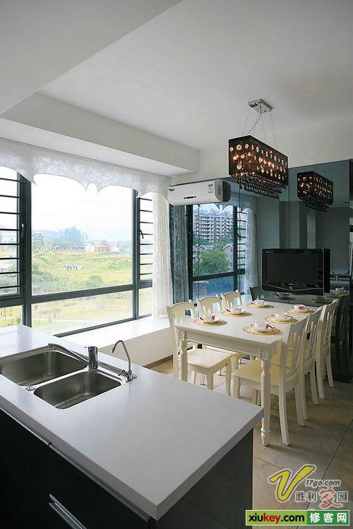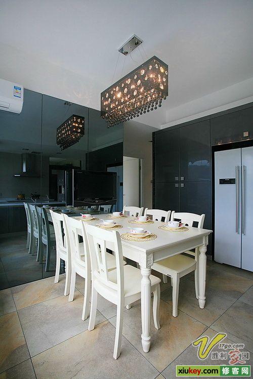首先,在空間處理上打破常規(guī),令廚房、餐廳、客廳三者之間形成了一個有趣的空間關(guān)系,讓純凈的世界不顯單調(diào)。具體做法是把原來餐廳的位置和靠廚房這邊臥室 的位置做了對調(diào),餐廳從客廳中獨立開來并與廚房構(gòu)成一個大的空間,這也正好是符合中國人的習(xí)慣,同時又利用原有承重墻充當了與客廳之間的屏障作用,使得客 廳也有了其完整性。餐廳廚房以清雅的冷灰色調(diào)為主,以簡、意、雅的感受滲透整個空間的每個細節(jié)中,整體造型上采用非常簡潔的直線條勾畫,背景墻面特意設(shè)計 成鏡面,打破了原本整塊墻面的沉悶,使整個空間顯得靈動時尚。