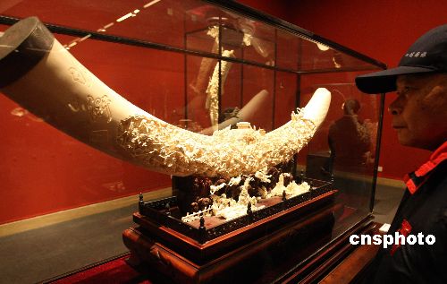 圖為中國工藝美術大展上別具特色象牙雕刻作品吸引觀眾。