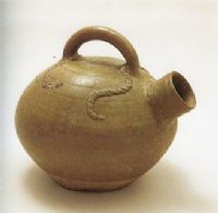 器身呈礅形,中部鼓出,底內(nèi)凹,肩腹間置一略上仰的筒狀口,頂部安一個弧形提梁。提梁兩端內(nèi)側(cè)各貼塑一條向兩邊彎曲伸展的帶狀紋,提梁后端外側(cè)飾一較短的帶狀紋,以象征虎的四足和尾。頂至腹上部尚劃有五道弦紋。施青釉,不及底,釉層均勻,光澤柔和。