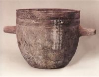 陶量平口,方唇,簡腹,平底,泥質(zhì)灰陶,腹上部兩側(cè)有一對(duì)稱的鋬耳,腹部至底施繩紋。