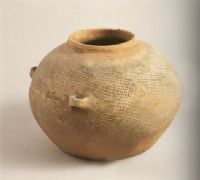 罐為灰色陶質(zhì),口微內(nèi)斂,平底,四耳,腹中部飾一道凹弦紋。肩腹飾以拍印方格紋。腹下部飾以三道不太清晰的刻劃弦紋。方格紋裝飾是漢代最流行的一種花紋裝飾。