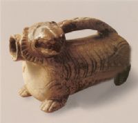 口部飾有虎首,軀體作圓筒狀,背有扁平提梁。四肢向前屈曲作臥伏狀。腹部和四肢刻劃條紋來(lái)表現(xiàn)虎斑。釉為醬黃色,剝落嚴(yán)重,剝落處露紅胎,胎質(zhì)疏鬆。此器形態(tài)生動(dòng)有趣,造型樸拙。陶瓷虎子在我國(guó)使用范圍很文,年代久遠(yuǎn),式樣頗多,此迺最早的一種。