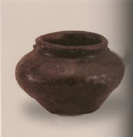 罐為小底,扁鼓腹,矮直口,口部下有兩個對稱的圓孔,可以穿系。此罐紫黑色胎,內(nèi)外均施黑釉,釉色光亮如漆。
