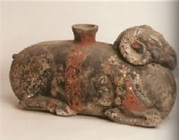 尊塑為臥羊式,可謂造型別致,匠心獨(dú)具。羊兩目炯炯注視前方,兩角前繞為半環(huán)式,軀干渾圓,凸胸,臀部有凸起短尾,背部有一喇叭式管狀注口,尾下與頸后分別有圓形與長方形鏤孔。