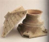 此井為灰陶質(zhì),井蓋與井身分開,井身呈罐形,井口平緣,折肩,腹部有一道凸弦紋裝飾,底緣呈四方形,四角各割去一小角,四角上各有一洞,應(yīng)為放置支撐井蓋的木條所用。