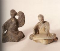 均以灰砂泥涅塑,火候較高。彈箏者曲膝跽坐,一箏橫置膝前,左手撫弦(陰線刻出),石手彈撥。頭戴軟帽,微向右偏,做凝神諦聽狀。身著圓領右袵長袍,線刻衣紋,曲折流暢;說唱者正襟危坐,兩腿分開,左手扶膝,右手上揚,做張口說唱狀。