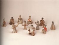 彩繪樂(lè)舞俑是在一個(gè)圓形彩繪陶盤上,塑造了二十五個(gè)人物,形態(tài)各異,栩栩如生。其中坐俑十二兒歌,站俑八個(gè),騎俑二個(gè),殘碎三個(gè)。均為泥質(zhì)灰陶,紅彩勾勒衣服。