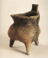 敞口、長頸內(nèi)收,圓肩,深腹圓鼓,三袋狀足。并在口的一側(cè)有一上仰的槽狀流。造型別致,具有明顯地方特征。