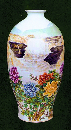 首度亮相的禮品瓷《源》、《脈》也有著很高的藝術(shù)品質(zhì)!对础芬渣S河標(biāo)志性景觀壺口瀑布做遠(yuǎn)景,以牡丹花團(tuán)錦簇為近景;《脈》以萬(wàn)里長(zhǎng)城做遠(yuǎn)景,以牡丹花團(tuán)錦簇為近景。兩個(gè)作品寓意著兩岸同胞都是炎黃子孫,血濃于水,同宗同源。