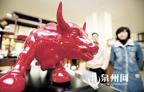 牛年將至,身披辣椒紅、寓意牛年開拓輝煌的牛形瓷器頗受市場(chǎng)歡迎。昨日,德化一家陶瓷企業(yè)的展廳內(nèi),前來訂購瓷器的客戶在一頭“猛牛”前駐足觀賞。(陳起拓 張九強(qiáng)攝)