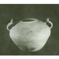 平沿圓口,短頸,斜廣肩,弧腹,下腹斂收,平底.肩部兩側各貼一耳,耳面壓印一手舉劍,一手持盾的武士紋飾,肩部飾雙弦紋四組,間刻人字形點紋,前后兩面并凸印玉壁形紋飾,其上端為人頭,下端為飄帶.