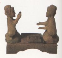 泥質(zhì)灰陶。兩人對(duì)坐於長方形臺(tái)座上正在博戲。一人雙手前伸,手心向上,另一人雙手斜上舉,掌心相對(duì)。兩人中間置放一方形盤,盤半邊放長條形箸六枚,半邊放一小方盤,即博局,在博局兩端各有六枚方形棋子。通體施綠釉。博戲是漢代盛行的一種娛樂活動(dòng),現(xiàn)已失傳。此器造型生動(dòng),人物形象逼真,具有時(shí)代特徵。