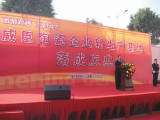 1月12日,陶業(yè)新銳企業(yè)佛山市威臣陶瓷企業(yè)三喜臨門,在隆重舉行新生產(chǎn)基地(即佛山市金尚美陶瓷有限公司)落成慶典的同時(shí),集辦公、展示于一體的綜合辦公大樓—— —威臣陶公館也盛大揭幕。來自全國各地的經(jīng)銷商、供應(yīng)商及同行等近600余人參加了本次慶典盛會(huì)。當(dāng)天下午,威臣陶瓷企業(yè)還在新中源大酒店舉行了以“激情跨越綻放09”為主題的全國經(jīng)銷商會(huì)議。新生產(chǎn)基地落成助飛兩大品牌