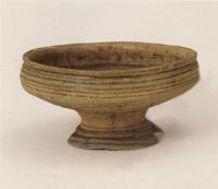 上為直口微斂,壁略鼓、圜底、淺盤,下為喇叭形座。通體飾并列弦紋,器表施青綠色釉。胎質(zhì)堅(jiān)硬,釉面晶亮。