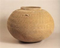 小口、低領(lǐng)、折肩,深腹圓鼓,平底近圜,上腹部有四個(gè)對稱的系耳并拍印密集的精美夔紋帶條裝飾,下腹部及底部拍印有密集的小方格紋。其造型與裝飾都具有明顯的地方特征。是一件裝飾美觀的陶容器。