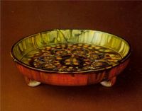 盤撇口,豐底,下承以三環(huán)形足。盤心刻花,中心刻一花蕊,外環(huán)一周蓮瓣紋,紋內(nèi)刻花,盤里施黃,藍(lán),白,綠等色釉,盤外為黃釉,底無釉。這件唐代三彩刻花三足盤,器形完整,圖案大方,蓮瓣紋鮮明突出,是唐代佛教盛行在陶瓷藝術(shù)中的反映。