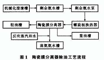 從機(jī)械化澄清槽來(lái)的氨水先流入剩余氨水槽,經(jīng)泵送到螺旋板換熱器換熱后再到陶瓷膜分離器過(guò)濾除油, 剩余氨水送到蒸氨氨水槽, 輕油從分離器頂部排出, 重油從底部排出。在剩余氨水出口用蒸汽和水反沖洗, 工藝流程見(jiàn)圖 1。