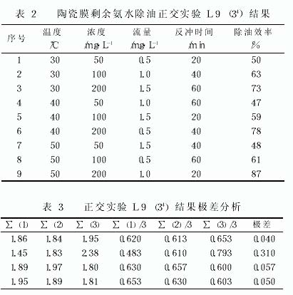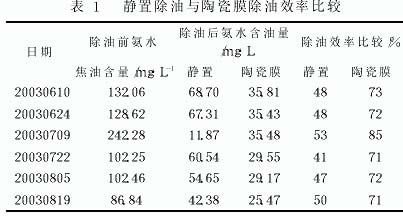 (2) 靜置除油與陶瓷膜除油的比較。靜置除油就是把剩余氨水放在大容積的貯槽內(nèi), 油滴靠重力作用下沉。靜置除油法只能除去直徑較大的油滴,除油效率在 50%以下。陶瓷膜除油在最初過(guò)濾階段, 依靠龐大的微孔和強(qiáng)大的表面能, 將固液兩相中的固相顆粒截留或吸附在表面上。當(dāng)過(guò)濾一段時(shí)間后, 在陶瓷膜的外面形成了濾餅, 濾餅就成了過(guò)濾的主要介質(zhì)。表1是靜置除油與陶瓷膜除油效率的比較, 采取陶瓷膜除油后, 效率由 40%左右提高到 70%以上。