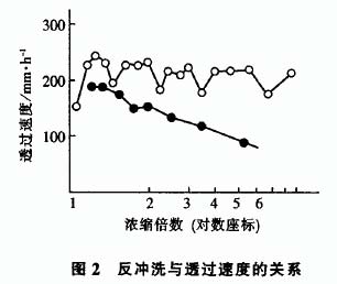 。1) 砂石過(guò)濾器與陶瓷膜過(guò)濾器的比較。砂石過(guò)濾器容易堵塞, 不能再生, 使用時(shí)間短,1年就需更換內(nèi)部濾砂。陶瓷膜分離器使用一段時(shí)間后也會(huì)堵塞, 用熱水反沖洗是一種非常有效的再生方法。當(dāng)陶瓷膜分離器阻力超過(guò) 1kPA 時(shí), 打開(kāi)蒸汽和水反沖洗 15Min, 就能夠恢復(fù)內(nèi)部填料的通透性, 使過(guò)濾性能恢復(fù)到原來(lái)的水平。圖 2 是反沖洗與透過(guò)速度的關(guān)系, 用熱水反沖洗不僅能除去覆蓋在填料表面的濾餅油渣, 還能除去膜孔中的細(xì)小顆粒, 使透過(guò)速度恢復(fù)到原有水平。