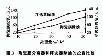 (3) 焦油浮選器和陶瓷膜除油的比較。我廠為了徹底解決剩余氨水的帶油問(wèn)題, 曾用焦油浮選器代替砂石過(guò)濾器處理剩余氨水, 取得了較好效果。但是用焦油浮選器除油投資太高, 圖 3 是焦油浮選器和陶瓷膜分離器除油的投資比較, 除油量每增加10M3/h, 焦油浮選器投資要比陶瓷膜分離器的投資高 10 萬(wàn)元以上。