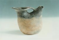 敝口,束頸,腹鼓,平底。流為袋狀,和口部用一寬把相連,把面上近口處有二圓孔。素面。上半部呈黑色,下半部呈紅色。