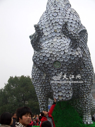 元宵佳節(jié)即將來臨,在景德鎮(zhèn)人民廣場,一只由該市有關(guān)部門于日前制作的大瓷牛,引起了中外游人的注意,大家爭先恐后地?fù)屩c大瓷牛合影留念。據(jù)悉,這只大瓷牛是用上萬塊青花瓷盤搭制而成,被譽(yù)為目前世界上最大的青花瓷牛。