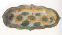 八曲海棠花式,寬折邊,淺腹,平底。盤口飾卷草紋,盤內(nèi)印盛開的折枝菊花,按花加凃黃、綠、白三色釉,白地、黃花、綠葉,色彩鮮明均勻,光艷潤澤。淺紅色胎,施三彩釉,有細(xì)開片紋。