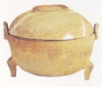 子口,圓腹,平底?谶呏靡粚Ψ叫呜Q耳,下腹部置三個獸形足。蓋為倒扣之弧腹碗,圈內(nèi)刻劃近似現(xiàn)代民間西瓜棋圖案。蓋面刻飾三圈水波紋,其間以弦紋相隔。腹部刻印方格紋和弦紋。