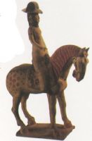 馬上坐一仕女,頭戴遮陽帽,櫻口朱唇,面容秀麗,上身穿窄袖白衫,外罩白褥衣,上繪紅色碎花,下穿黃色百褶裙,足蹬黑色尖頭鞋。右手持韁,左手下垂。馬身為黃色,臀部有紅斑。馬具齊全,立於長方座上。