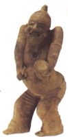 泥質(zhì)灰陶。頭戴旋鈕軟帽,雙目微睜,舌頭外吐,聳肩縮頭。右手執(zhí)鼓槌,左手持鼓,正欲敲擊。挺胸凸腹,臀部後翹,雙腿微曲,右腿前伸,左腿靠後,用以支撐身體。