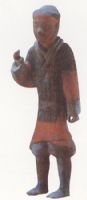 泥質(zhì)灰陶。俑施以紅、黑、白色彩繪。身穿黑色鎧甲,腿部絮行縢,右手前舉,左手下垂,左手有插孔。背後有方形箭囊,其上有插箭孔。