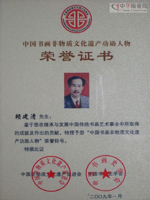 2009年1月20-22日,中國書畫非物質(zhì)文化遺產(chǎn)大會于全國人大會議中心會議廳隆重舉行。此次大會由國家文化部中國非物質(zhì)文化遺產(chǎn)促進會等主辦,邀請全國參會代表120位。當代實力派書畫藝術家賴建清受邀,并被授予“中國書畫非物質(zhì)文化遺產(chǎn)功勛人物”榮譽稱號。期間,他還在北京大學舉行的“2009年中國書畫藝術高峰論壇”上作二十分鐘的專題演講。