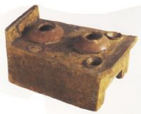 泥質(zhì)紅陶,上施黃釉。竈的平面為長方形,中空,前端略寬,有長方形落地火門,上有梯形擋火牆。竈面有二大二小四個火眼,在兩個大的眼上各置一釜。竈的後端有高約二點七厘米的竈牆,牆上塑出煙道。