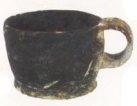 泥質灰陶。斂口,筒形腹微鼓,圈足。腹部置一寬扁半圓形把柄。