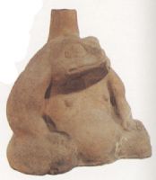 泥質(zhì)灰陶。器形為蛙首人身,雙目圓睜,袒胸露腹,背部置一圓柱形插孔。東漢墓葬出土,為隨葬明器。