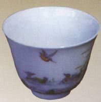 敞口,深腹,平底,圈足。胎質(zhì)堅硬潔白,胎體輕薄,迎光見影,釉面潔白光潤。腹部一側(cè)繪五彩鴛鴦臥蓮圖,另一側(cè)以青花題寫輿花卉相應(yīng)的詩句:“根是泥中玉,心承露下珠”。