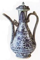 喇叭口,細(xì)長(zhǎng)頸。碩腹,圈足,通體呈八棱狀。上有覆盆式圓鈕蓋,蓋的一側(cè)有一小環(huán)形繫,器身一側(cè)有彎曲長(zhǎng)流。另一側(cè)堆貼曲柄,柄上端附一繫。胎體堅(jiān)硬,胎色灰白。通體繪青花紋飾。蓋面飾覆式蓮瓣紋。紋飾布局有序,線條流暢。