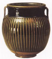 直口,捲沿,直鞭,圓頸,圈足。腹部飾凸起的平行豎線紋,線呈白色。頸肩部塑有對稱的蕖形雙繁,其上刻劃葉紋樣。器內(nèi)施醬色釉,器外為黑釉。白線紋裝飾的瓷器為山柬、河南一帶所產(chǎn),具有較強的地方特色。