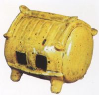 呈長(zhǎng)鼓形,正面鏤兩個(gè)大小相同的方形孔及條狀臺(tái)面,是供雞出入之處。舍頂貼塑瓦檐,底置四個(gè)柱腳以隔潮瀑,反映了當(dāng)?shù)鬲?dú)特的習(xí)俗。此器十分珍貴,較為少見。