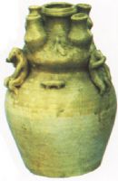 罐分上下兩部分,上部頂端有五個(gè)平均分布的小罐,中間i個(gè)較大,為洗式口,下承長(zhǎng)頸,瓶底與罐身相通,肩部塑有三雙小熊,熊間堆有一蛇兩犬。器施半截釉,釉淡青色。此罐造型別致,裝飾新穎,富於趣味性,漢墓出土,但釉有剝蝕。