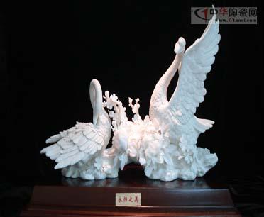《永恒之美》取義于兩只白天鵝,這也是中國傳統(tǒng)美好的一個象征。兩只白天鵝悠閑自在,一只在為自己搔癢,一只展翅,她們在用她們之間的和諧、溫馨詮釋著生命的美好,生活的美好。細(xì)看胎質(zhì)細(xì)膩,如脂似玉,瑩潤如水,線條優(yōu)美柔和,這是結(jié)合德化獨(dú)特的“白如雪、潤如玉、透如絹”的“中國白”的優(yōu)美瓷質(zhì),將作品雕刻得栩栩如生,假假真真,真真假假,展示出了高潔、素靜淡雅的品質(zhì)。