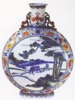 瓶呈扁圓形,繪有農(nóng)耕圓景,底書“大清乾隆年製"款,為乾隆官窯之器。門彩瓷器始燒於明代成化時期,但大多是小件器物,如碗、杯、盤、盞等。清代時門彩大件器物增多。