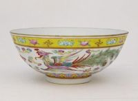 碗口微撇,弧腹,圈足。碗內(nèi)光素。外壁以粉彩裝飾,有紅、粉、藍、黃、翠綠和金彩等多種色彩,繽紛艷麗。近口沿處的黃釉地上繪蝙蝠、桃和“卍”字,外腹飾龍鳳戲珠紋,間以祥云紋,龍鳳圖案的筆觸較為呆板,近底處飾變形蓮瓣一周。外底署紅彩“大清光緒年制”六字楷書款。