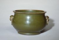 “茶葉末釉”是廠官釉的一種,這個仿銅器制作的瓷爐釉面潤澤,古意盎然。