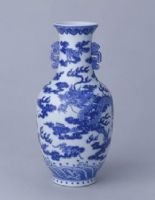 瓶撇口,直頸,溜肩,長圓腹,圈足。頸的兩側(cè)對(duì)稱置螭耳。內(nèi)施白釉,外壁繪青花云龍紋,輔以如意云頭紋、海水紋、圈點(diǎn)紋等邊飾。圈足內(nèi)施白釉。外底署青花篆書“大清嘉慶年制”三行六字款。