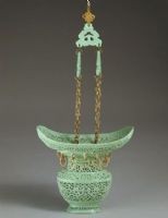 花籃呈元寶狀,寬口沿,兩端上翹,短頸,扁圓腹,圈足微外撇?谘叵嘛椊鸩驶瞽h(huán)12個(gè)。提梁由兩串金彩套環(huán)與三片鏤空火焰紋瓷片組成。外底署胭脂彩“大清乾隆年制”三行六字篆書款。通體施松石綠釉,以鏤空龍穿花紋裝飾。