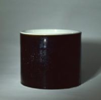 筆筒口底相若,直壁,平底。里施白釉,外壁通體施烏金釉,釉面漆黑明亮。釉上以金彩描繪紋飾,金彩雖全部脫落,但迎光側(cè)視,仍可見圖案痕跡:一面有委角方形開光,開光內(nèi)繪山水人物紋。另一面書蘇軾《后赤壁賦》全文,文末書“己丑歲仲冬月右錄赤壁賦”及兩枚圓、方閑章款。外底施白釉,中間有一周玉璧形澀圈。無款識。