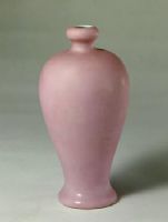 瓶口內(nèi)斂,口形如蒜頭,短頸,豐肩,肩以下漸斂,圈足微外撇。通體施淡粉色釉,屬低溫金紅釉。瓶里及底均施白釉。底青花雙圈內(nèi)楷書(shū)“大清雍正年制”六字款。
